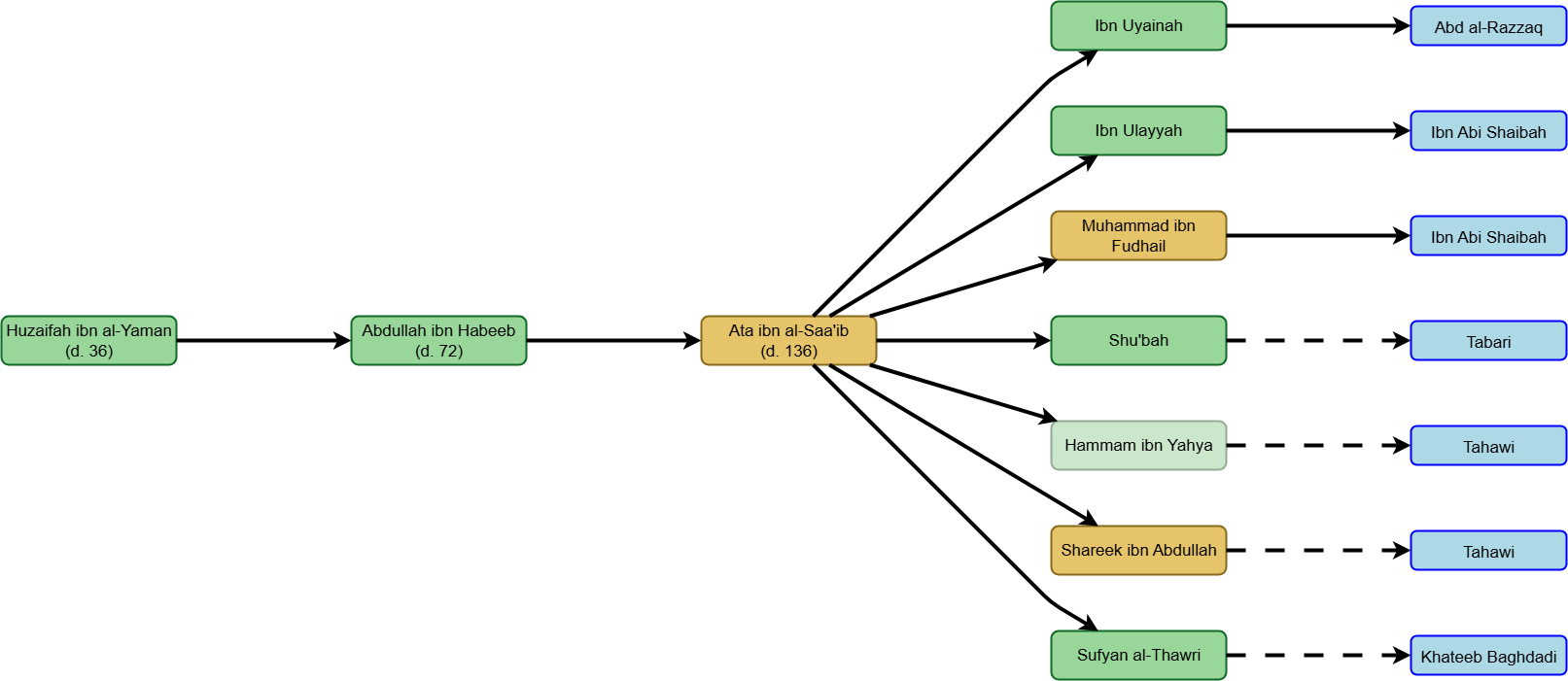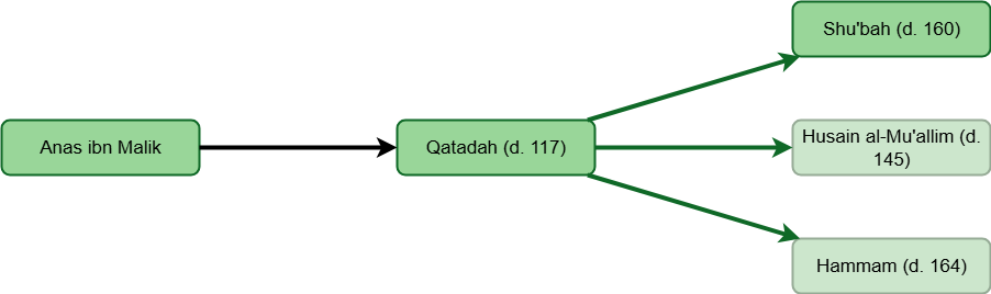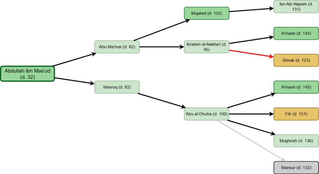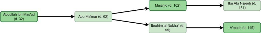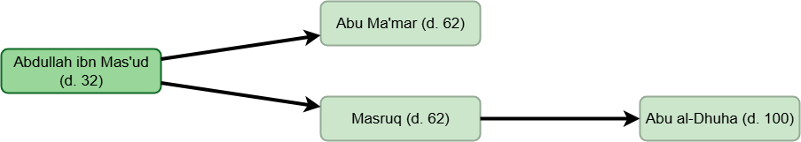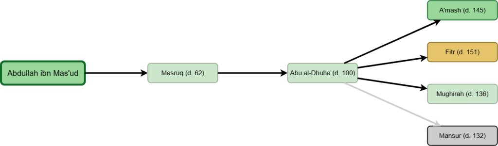 The earliest narrator with multiple chains to him in the hadith analyzed above would be Abu Ma’mar (d. 62). After him, the earliest narrators with multiple chains to them are Ibrahim al-Nakha’i (d. 96), Abu al-Dhuha (d. 100) and Qatadah (d. 117). Then, close after them are narrators like Ata ibn al-Saa’ib (d. 136) and Husain ibn Abd al-Rahman (d. 139). Then, close after them are narrators like Shu’bah (d. 160) and Bakr ibn Mudhar (d. 174).