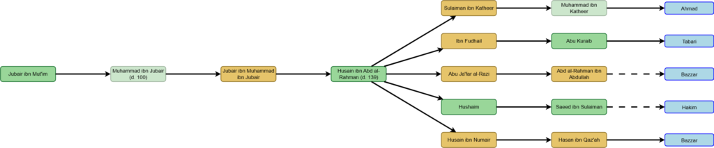 Husain ibn Abd al-Rahman narrated this from Jubair ibn Muhammad ibn Jubair from (his father) Muhammad from (his father) Jubair ibn Mut’im. Some narrators omit Jubair ibn Muhammad from the chain.