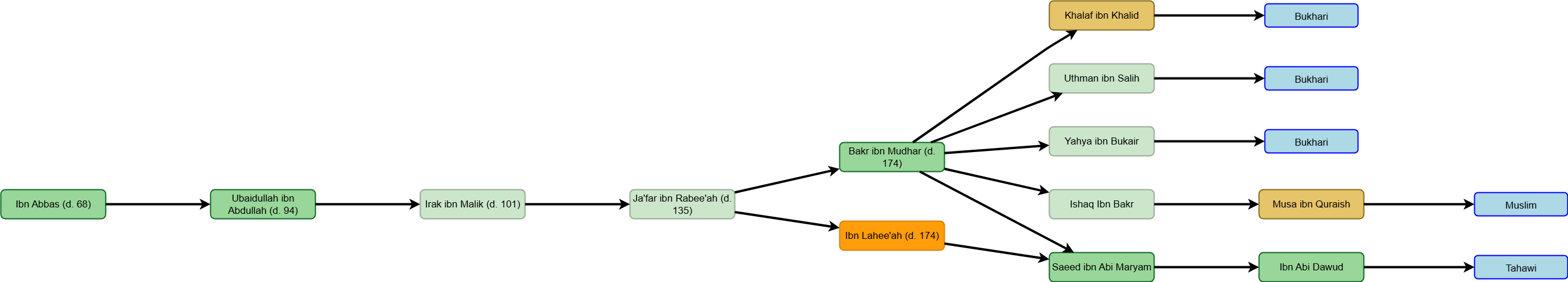 All of these narrators were known and reliable. Bakr and Ja’far were Egyptian scholars. Irak ibn Malik was Madani, and Ubaidullah and Ibn Abbas were Makkan.